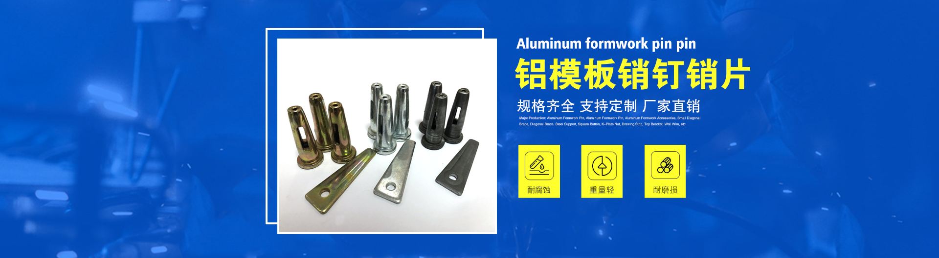 銷釘銷片、鋁模板配件、斜支撐、方通扣等。